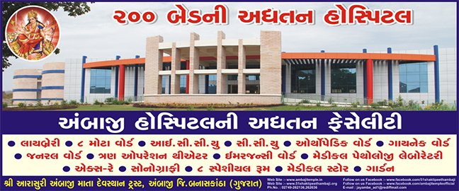 | Shri Arasuri Ambaji Mata Devasthan Trust remains always active to provide all kinds of facilities to local residents as well as all the devotees of Mata Ambaji, coming from all over this world. A Modern Cottage Hospital with 45 beds, under the direct supervision and services of some qualified resident doctors, is also run and managed by Shri Arasuri Ambaji Mata Devasthan Trust, with the expenses of about Rs.12 lakhs per year in the large interest of safeguarding the health of the people of Ambaji & surrounding tribal area. This cottage Hospital has its own pathological laboratory, X-Ray Clinic, labour room, male & female wards, and Gynecological as well as other surgical sections. As per the survey made, more than 150 to 200 outdoor patients and about 10 to 15 indoor patients get everyday medical services in this hospital totally free of charges. Moreover a Mother & Child Welfare Clinical Services are also provisionally arranged by this Hospital on each Monday and Leprosy Clinical Services are provided on each Thursday. This medical facilities of Cottage Hospital has proved to be a boon to the people of Ambaji and surrounding tribal area. SAAMDT also tries successfully to arrange visiting Doctors of some specialities. | ||
