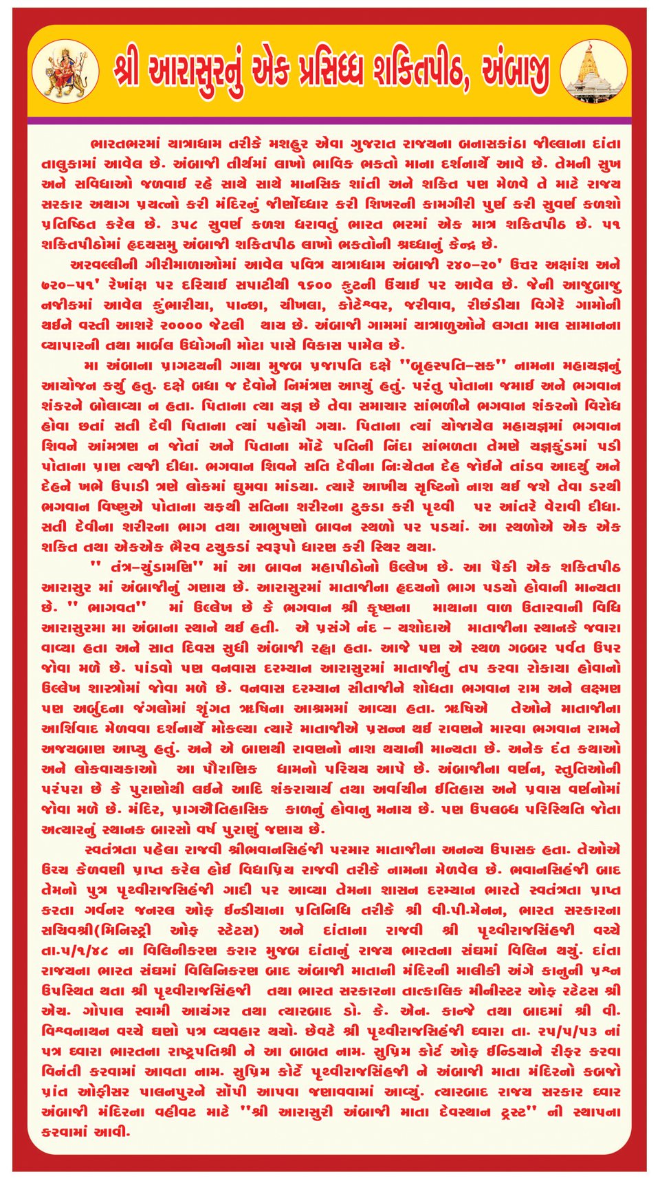 ભારતભરમાં યાત્રાઘામ તરીકે મશહુર એવુ શ્રી આરાસુરી અંબાજી માતા મંદિર ગુજરાત રાજ્યના બનાસકાંઠા જીલ્લાના દાતા તાલુકામાં આવેલ . જે એક પુરાણપ્રસિદ્ધ શક્તિપીઠ તરીકે ઓળખાય છે. અંબાજી તીર્થમાં લાખો ભાવિક ભક્તિનો માના દર્શાનાર્થે આવે છે. તેમની સુખ અને સુવિધાઓ જળવાઈ રહે સાથે સાથે માનસિક શાંતિ અને શક્તિ પણ મેળવે તે માટે રાજ્ય સરકાર અથાગ પ્રયત્નો કરી મંદિરનો જીર્ણોધ્ધાર કરી શિખરની કામગીરી પૂર્ણ કરી સુવર્ણ કળશો પ્રતિષ્ઠિત કરેલ છે. 358 સુવર્ણ કળશ ધરાવતું ભારત ભરમાં એક માત્ર શક્તિપીઠ છે. 51 શક્તિપીઠોમાં હૃદયસમુ અંબાજી લાખો ભક્તોની શ્રદ્ધાનું કેન્દ્ર છે.